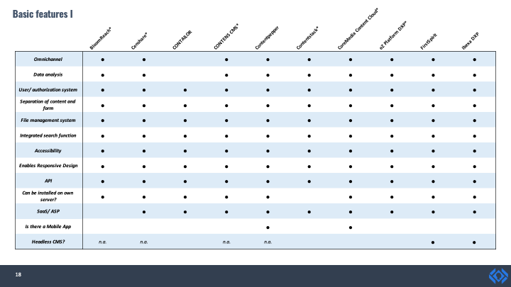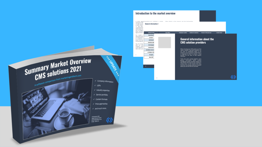 This year’s market overview for Content Management Systems is already in its fourth edition. In the 2018 market overview, we compared 12 solutions, in the 2019 market overview, 14 solutions, and in 2020, 17. This year, we were able to convince even more providers to participate and present 20 enterprise CMS in this market overview. These are compared in 13 categories and based on over 124 criteria. This makes it much easier for you to orient yourself when selecting software. You can download the comparison as a PDF.
